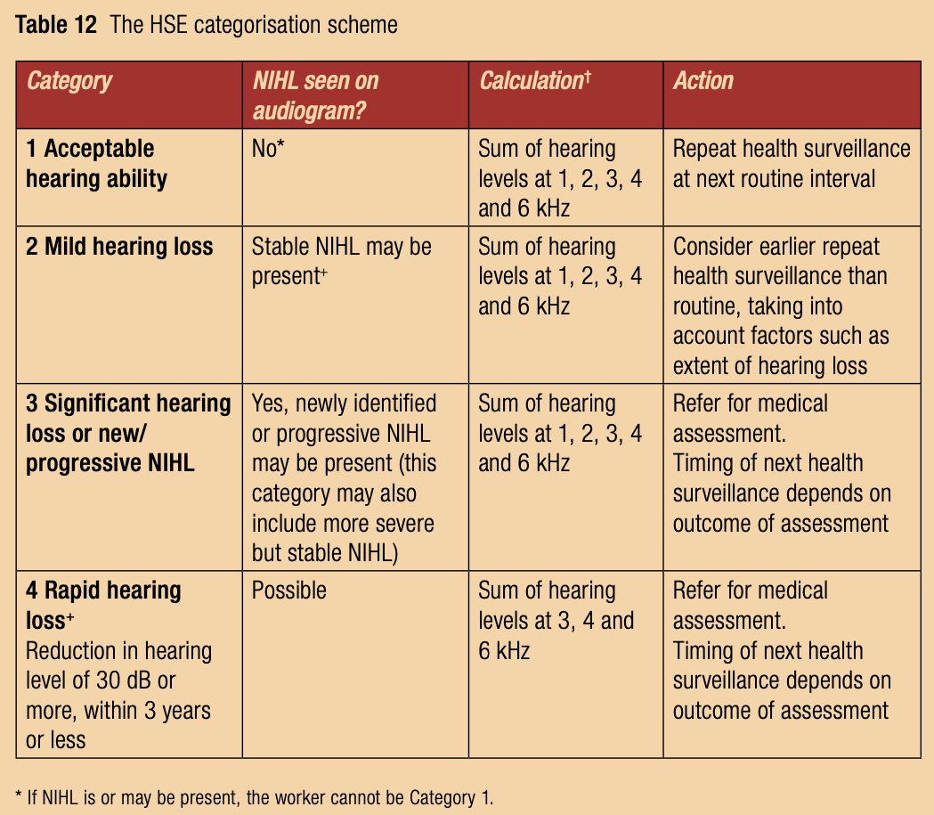 The hearing tests are categorised according to criteria set out by the HSE in L108, Controlling Noise at Work (Third Edition) and are: