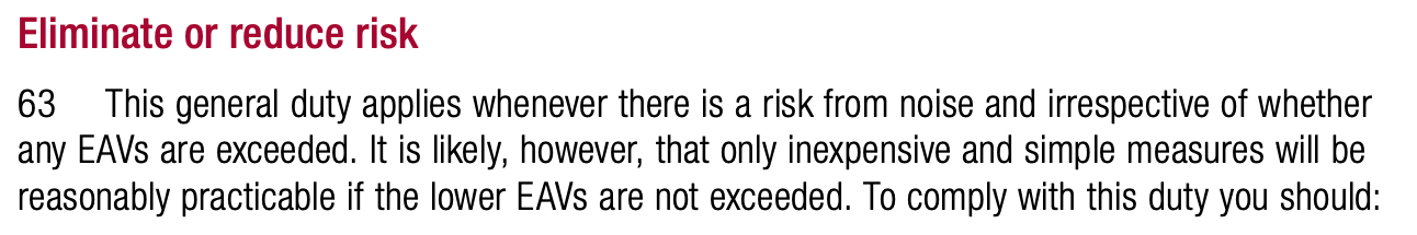 So, where levels are below the lower 80 dB(A) limit, item (1) does mean the employer still needs to look at reducing noise levels further if they can but then item 63 in the guidance above stresses ‘inexpensive’ or ‘simple’ measures.