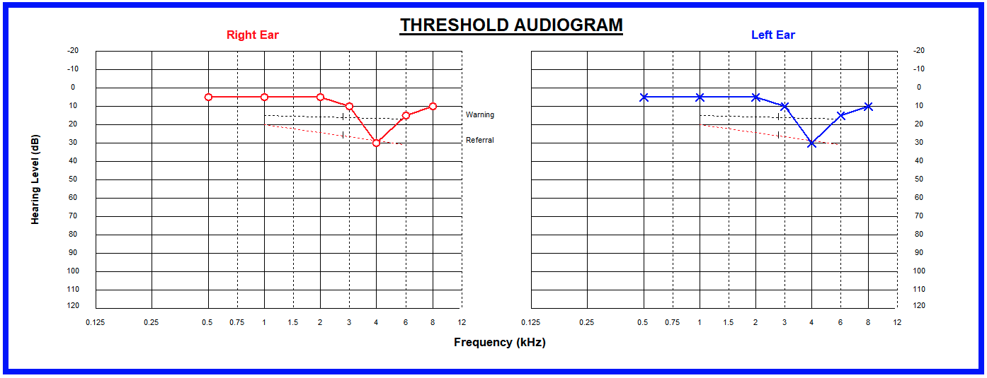 Quick background info for non-noise people: you will see ‘notch’ mentioned, this means a dip in the higher frequency hearing and it is this that the HSE take as a sign of noise induced hearing loss (NIHL). If there is a notch in the results then as far as the HSE are concerned, that may be noise damage and the follow-up investigations are now needed.